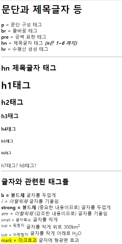 | <b>hn</b> = 제목글자 태그 <b><i>(n은 1~6 까지)</i></b> |