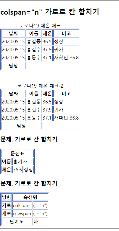 | <h2>colspan="n" 가로로 칸 합치기</h2> |