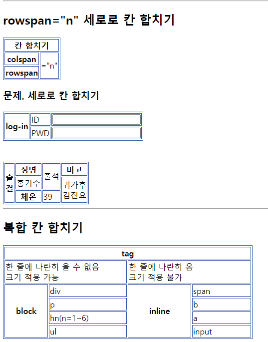 | <h2>rowspan="n" 세로로 칸 합치기</h2> |