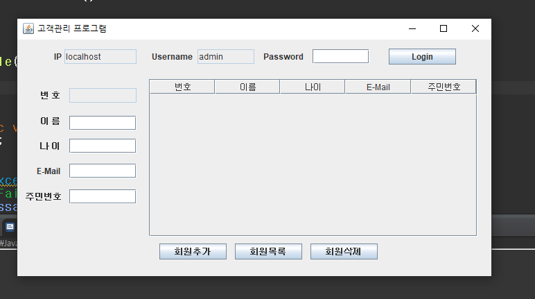 DB와 연결하여 로그인 기능과 회원추가 기능, 그리고 login 버튼을 눌렀을 경우의 경고창 , 회원 추가 버튼을 눌렀을 경우의 경고창을 넣어보았고, Login 이 완료되었을 경우 패스워드 창도 Editable을 false로 변경해줘서 입력이 불가능하게 만들어준 후, Login을 Logout으로 글자를 바꾸어 보았다. GUI 부분은 눈으로 바로바로 보이기도 하고 재미있는 기능이 많아서 재미있다. JOptionPane.showMessageDialog(null, "로그인 실패","오류",JOptionPane.ERROR_MESSAGE);